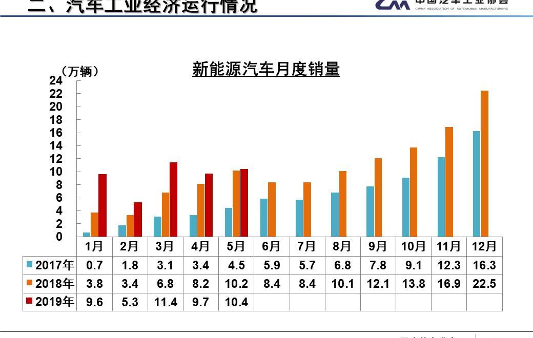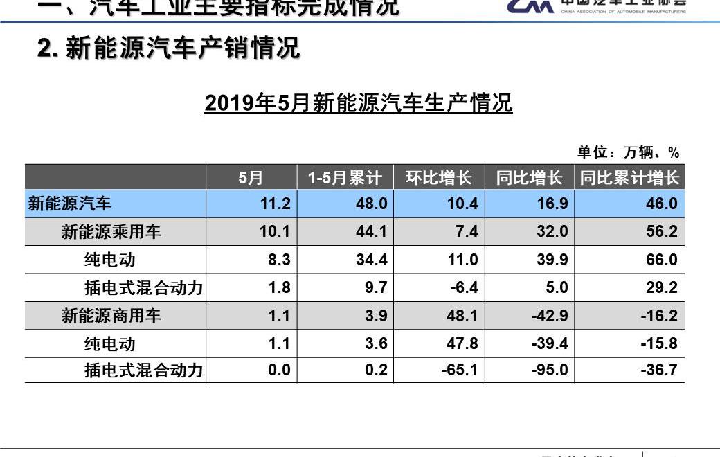 2019年前5个月,新能源汽车产销分别完成48万辆和46.4万辆,同比分别增长46.0%和41.5%。其中,纯电动汽车产销分别完成38万辆和36.1万辆,同比分别增长52.0%和44.1%;插电式混合动力汽车产销分别完成9.9万辆和10.3万辆,同比分别增长26.4%和32.7%。燃料电池汽车产销分别为553辆和545辆,同比分别增长476.0%和479.8%。