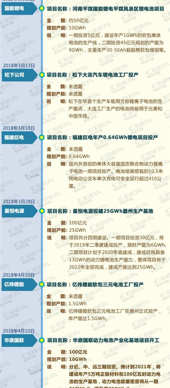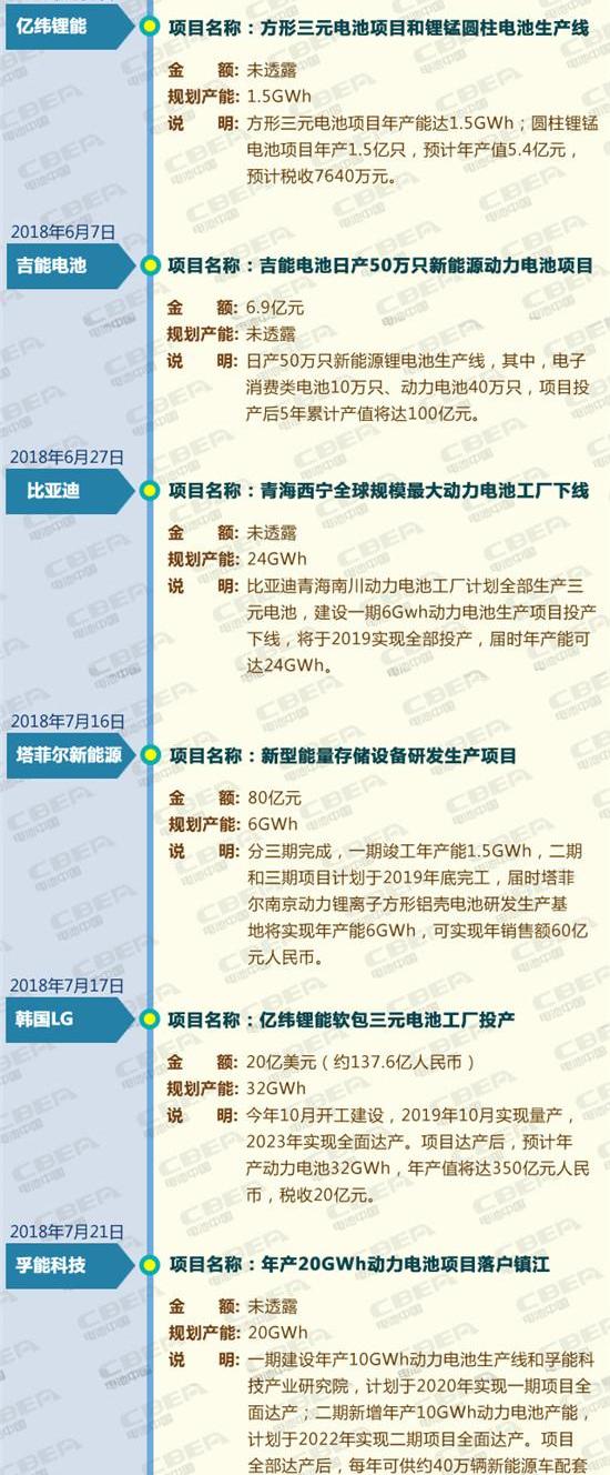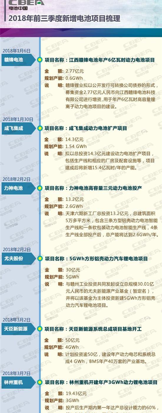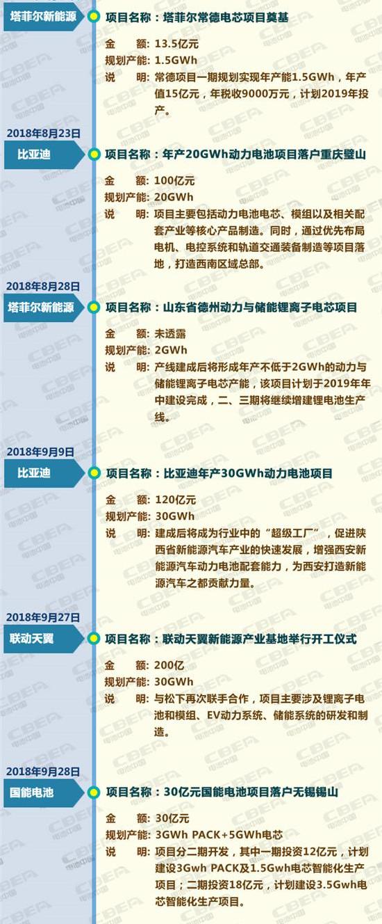 在政策的帮助下,中国新能源汽车产业实现了快速发展。中汽协数据显示,2017年,我国新能源汽车产销接近80万辆,分别达到79.4万辆和77.7万辆,增速分别为53.8%和53.3%,产销增速分别提高2.1和0.3个百分点。作为动力电池的核心部件,市场也在迅速扩张,目前已发展到千亿级别。如此巨大的市场,自然成为所有企业的必争之地。据中国电池网不完全统计,2018年前三季度,中国动力电池领域至少有24个投资项目,总投资超过1000亿元,计划产能超过230GWh,动力电池资金投入有增无减。具体投资情况如下: