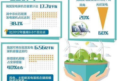 装机容量不断增加。“2017年,中国发电总装机容量达到17.7亿千瓦,其中非化石能源装机容量达到38.1%,比2012年增长9.6个百分点,这是历史上增长最快的时期。”国家能源局局长努尔·白克力透露,2017年,中国可再生能源发电装机容量约6.56亿千瓦,新增装机容量占全球增长的40%左右。在建风电和太阳能发电装机容量居世界第一,已成为全球非化石能源发展的引领者。值得注意的是,可再生能源已成为我国新增电力的主力军,光伏、风电等新能源的增长尤为突出。根据国家能源局的数据,2017年前三季度,光伏发电装机容量大大超出预期,新增光伏发电装装机4300万千瓦,同比增长65.4%。截至2017年9月底,中国光伏发电装机容量已达1.2亿千瓦,其中光伏发电厂9480万千瓦,分布式光伏发电2562万千瓦。在风电方面,2017年前三季度,全国新增风电并网容量970万千瓦,截至9月底,累计风电并网能力达到1.57亿千瓦,同比增长13%;2017年前9个月,全国风力发电量2128亿千瓦时,同比增长26%;