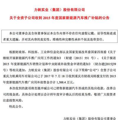 7月20日,力帆实业(集团)有限公司(以下简称“力帆”)宣布,公司全资子公司重庆力帆乘用车有限公司于2017年7月18日收到重庆市财政局2015年度新能源汽车推广应用补贴共计1388.4万元。