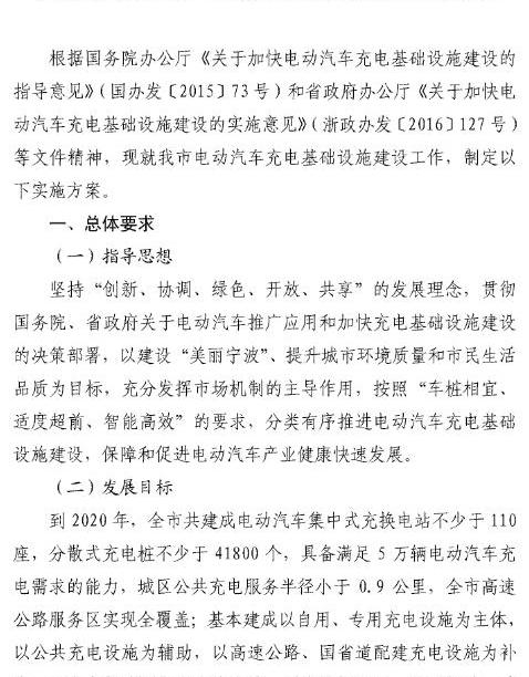 近日,宁波市正式发布《宁波市电动汽车充电基础设施建设实施方案》,提出到2020年,全市电动汽车集中充换电站不少于110座,分散式充电桩不少于41800个,可满足5万辆电动汽车充电需求。