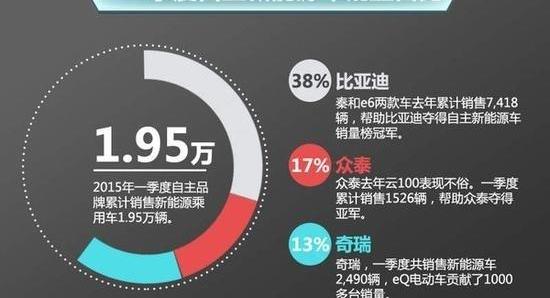 近日,协会公布了今年第一季度自主品牌的销量,比亚迪居首,以7418辆的成绩夺得冠军。去年,比亚迪销售了1.8万辆新能源汽车,今年第一季度完成了去年总销量的40%。在新能源销量前三名中,众泰以3453辆位居第二。排在第三位的是奇瑞,该公司第一季度销售了2490辆新能源汽车。紧随其后的是北汽和吉利。北汽e系列纯电动汽车一季度共售出1950辆,是一季度销量最高的纯电动汽车。6-9分别是上汽乘用车、江淮、腾势和广汽传祺。对于下一阶段的发展,各大汽车公司都有计划。