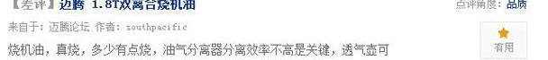 主要缺点在于机油燃烧,这是大众奥迪的一个常见问题。车主南太平洋表示,“烧机油,真的烧,有点烧。油气分离器分离效率低是关键。可以安装透气水壶。届时建议不要安装涡轮端,有中冷,涡轮端不会有太多漏油。”