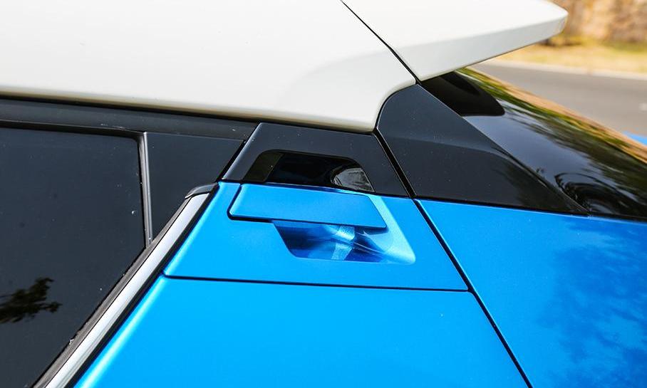后门把手设置在C柱上方,有点高,但在实际使用中没有任何不便。值得注意的是,为了给悬浮式车顶更好的视觉效果,车门把手的上半部分将采用黑色设计。