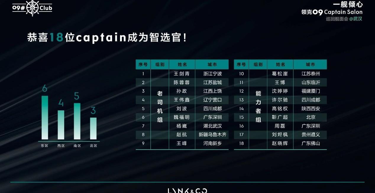作为用户品牌,领克始终秉承“来自用户,走向用户”的理念,打造以用户需求为核心的产品。作为一款旗舰SUV,领克09也继承了这一理念,不仅为用户打造了09 Captain Club,还在全球首发中发起了“the NEXT”共创行动,从产品、社区、开放、生态四个维度与用户打造协同创新的驾驶体验。在武汉船委会当天,领克09公布了18位“智选官”入选用户名单。“领克09智选官”招聘活动于7月9日开始,7月19日结束。共有654名用户提交了申请材料。经过意向、匹配、品牌偏好、影响力、产品专业度五个维度的综合评价筛选,共从全国各地选出18名“领克09智选官”,属于不同年龄段。领克09智选官将作为用户代表,收集和组织用户对领克09产品的意见和建议,并参与领克09实车的动态和静态评估。并与9位媒体代表、9位研发工程师和行业专家代表组成了一个36人的智选团队,对领克09的产品配置进行讨论和选择,最终确定领克09上市车型的产品配置。