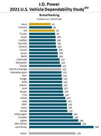 骏迪发布了2021汽车质量可靠性研究报告,特斯拉在33家汽车制造商中排名倒数第四。2021骏迪汽车可靠性研究涉及8000名三岁车主。通过问卷调查,收集了各品牌车主在过去一年中遇到的故障问题的数量和类型。故障问题越少,评估得分就越高。Jundi共跟踪了八类177个故障,包括加热和空调系统、信息娱乐系统、外观缺陷、动力总成故障等。该评估的平均得分为每100辆车发生121次故障。特斯拉的调查结果显示,每100辆车平均发生176起故障,仅超过捷豹、阿尔法-罗密欧和路虎。排名前三的品牌是雷克萨斯、保时捷和起亚。