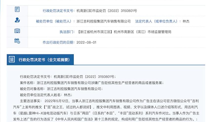 上述被处罚的公司是浙江吉利控股集团汽车销售有限公司。市场监督管理局认为,吉利销售公司构成利用广告贬低其他制造商和经营者产品的行为,责令其停止发布广告,并处1万元罚款。