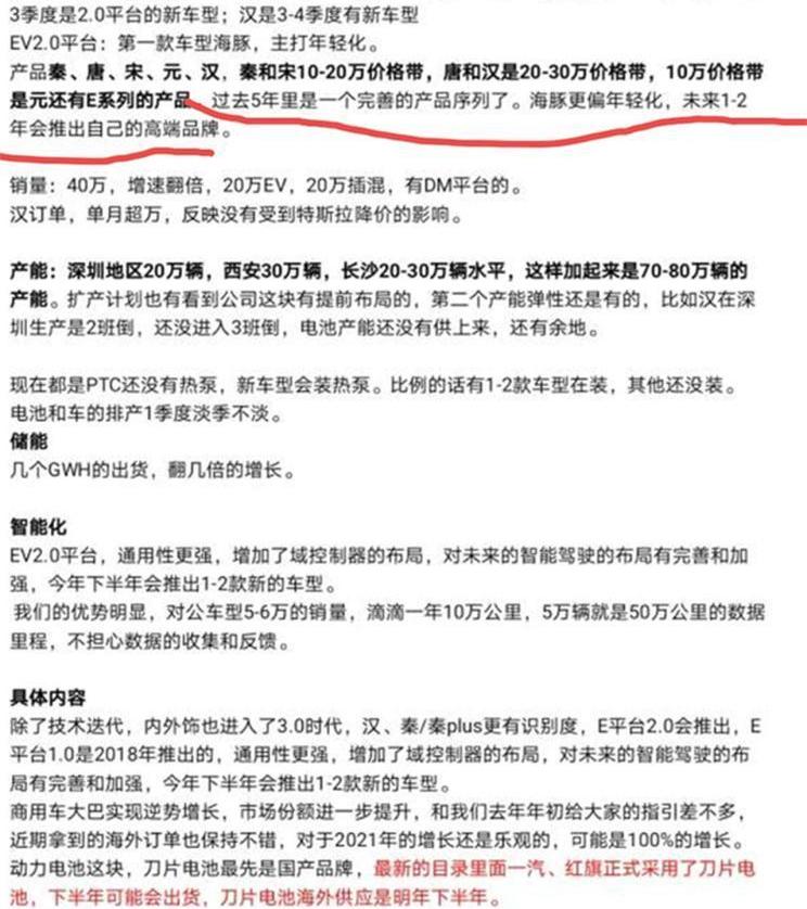 此外,根据比亚迪的官方声明,该品牌将在未来1-2年推出其高端品牌车型,该车型可能与“王朝”有关,并将配备热泵空调。在动力电池方面,比亚迪计划在2021下半年向红旗提供叶片电池,并可能在2022年下半年向海外提供叶片电池。