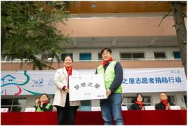 现代汽车集团第73届“梦想之家”浙江站捐赠仪式现代汽车(中国)投资有限公司社会贡献部部长沈在敏向三都子里小学校长王荣赠送“梦想之屋”牌匾