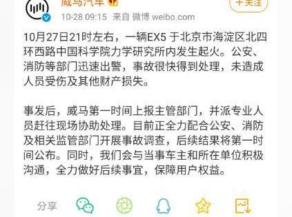 据国内汽车新闻报道,已从相关4S店获悉,今年6月至10月,车内使用的中兴充电电池可能存在问题。在这个阶段,买家已经接到通知,要一个接一个地更换它。之后,国内汽车新闻将进一步追踪相关信息。官方回应如下:10月27日21时,一辆EX5在北京市海淀区北四环南街中国科学院结构力学研究实验室起火。机关、消防安全等单位迅速响应报警,安全事故迅速得到解决,未造成人员受伤或经济损失。事件发生后,威马立即向监管部门报告,并派遣技术专业人员前往现场帮助解决问题。目前,我们正在全力配合机关、消防安全和相关监管机构开展事故调查,调查结果将尽快公布。此外,大家将积极与购车人及其所属单位沟通交流,全力做好事后事宜,确保客户利益。目前,威马汽车正在全力配合机关、消防安全和相关监管机构开展事故调查,调查结果将尽快公布。