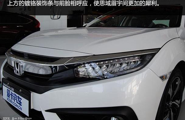 第十代CIVIC(思域)的外观发生了重大变化,其酷炫的溜背造型和无缝的车身线条不仅令人印象深刻,而且大大降低了风阻系数。采用全新家族飞翼式帅气前脸,肌肉感更强;LED灯组与之呼应,打造出前沿犀利的动感造型,具有强烈的运动感和时尚感;新车的尾部设计比前脸更加大胆,尾部的整体流线更像是一款轿跑车型。漩涡飞镖式尾灯动感十足,引人注目。