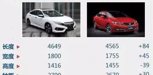 第十代思域的车身尺寸为4649/1800/1416毫米,轴距长度为2700毫米。如果与目前的车型相比,第十代思域在车身尺寸上有了显著的升级。车身长度增加了84毫米,宽度增加了45毫米,轴距加长了30毫米。“三维数据”的全面提升,也为新车带来了更宽敞的内部乘坐空间。