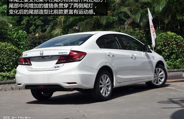 汽车尾部的尾灯和保险杠的细节也进行了修改。中间的镀铬条穿过汽车后部的两侧,保险杠上增加了三块反光板和黑色装饰条。更换后的车尾比前一款更具运动感。2014款思域在后备厢增加了一个打开按钮,以方便用户操作。此外,新车在舒适版和豪华版上都配备了倒车雷达和倒车视频功能。