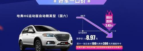 冠军车哈弗H6运动版的五折优惠和双11购物狂潮实际上早在“双11”购物狂潮到来之前就被哈弗预热了。哈弗在天猫推出“好车五折”促销活动,拉开了“双11”购物狂潮的序幕。以哈弗H6运动版为例,消费者只需在天猫旗舰店活动页面支付2999元意向定金即可参与抽奖。只需5.7万元,哈弗H6运动版自动精英版(国六)就能立即开回家。