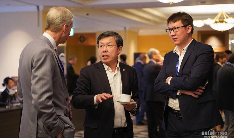 大成汽车集团有限公司董事长吴晓、世界汽车工程师联合会主席赵福泉、清华大学汽车工业与技术战略研究院院长与外国汽车专家讨论行业问题