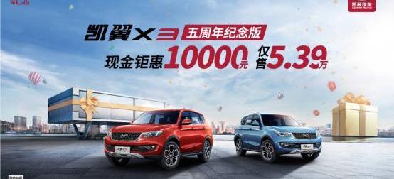 促销期间,热门车型凯翼X3推出5周年纪念版,现金奖励1万元,仅售5.39万元。凯翼X3的整体外观设计具有年轻时尚的布局,长、宽、高为4335/1796/1665mm,轴距为2530mm。它配备了17英寸的车轮、电动调节的外后视镜和车顶行李架。内饰配置方面,标配10.1英寸中控屏、7英寸TFT仪表盘、倒车摄像头、智能联动屏多屏联动、导航系统、自动大灯、胎压监测、前后USB接口等,无疑是非常适合城市休闲交通的车型。凯翼五周年的盛大促销,为这个金秋购车的消费者提供了全面的优惠政策。无论是现金折扣幅度,还是选择金融购车,购车门槛都大大降低,让用车梦想触手可及。同时,凯翼汽车还为消费者的后期驾驶体验提供了全面周到的保障,一方面降低了他们的驾驶成本,立即购车并享受终身免费保养。另一方面,给予发动机10年/10万公里超长保修作为奖励,在质量方面为消费者提供放心的体验!凯翼盛赞中华人民共和国成立70周年,宣传金秋时节,适时买车。立即进入商店,还有更多惊喜。