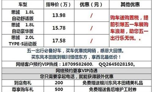1900/1/1 0:00:00五一提前庆,大武口东风本田4S店特推出大型优惠活动,购买本田思域18L车型可享受现金直降8000元,2