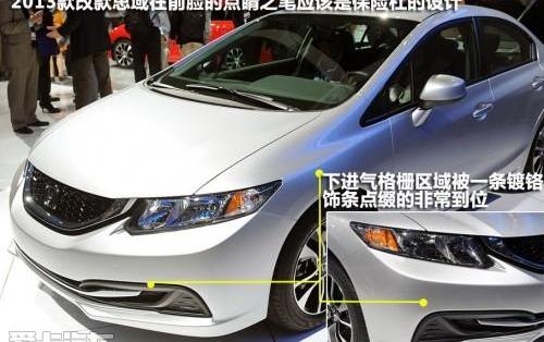 首先,我们来看一下2013款思域的前脸。进气格栅摒弃了现款汽车销售车型的横幅设计,采用了更具运动感的格栅进气格栅。同时,上方的大尺寸镀铬饰条也被改为U型,放置在进气格栅的下部和两侧。这种设计与一起出现的第九代优雅亭台楼阁有相似之处,也有不同之处。