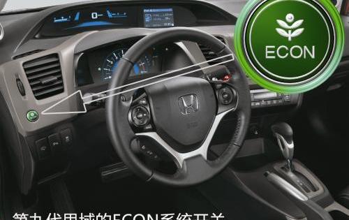 在第九代思域的方向盘左侧,有一个绿色按钮。这个按钮是ECON系统,也被称为节能支持系统。这是本田首次在中国市场推出的车型中标配该系统。