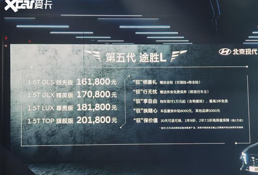 4月12日,北京现代第五代途胜(参数|询价)L正式上市,售价区间为1618-201800元。作为家族中的第五代车型,第五代途胜L设计新颖,科技感强,融入了许多当前时尚的设计元素,搭载1.5T发动机和7速双离合变速箱的动力组合。北京现代第五代途胜L官方指导价车型价格:1.5T GLS领先版:16.181.5T GLX精英版:17.081.5T LUX尊贵版:18.181.5T顶级旗舰版:20.18 ECCAR.com