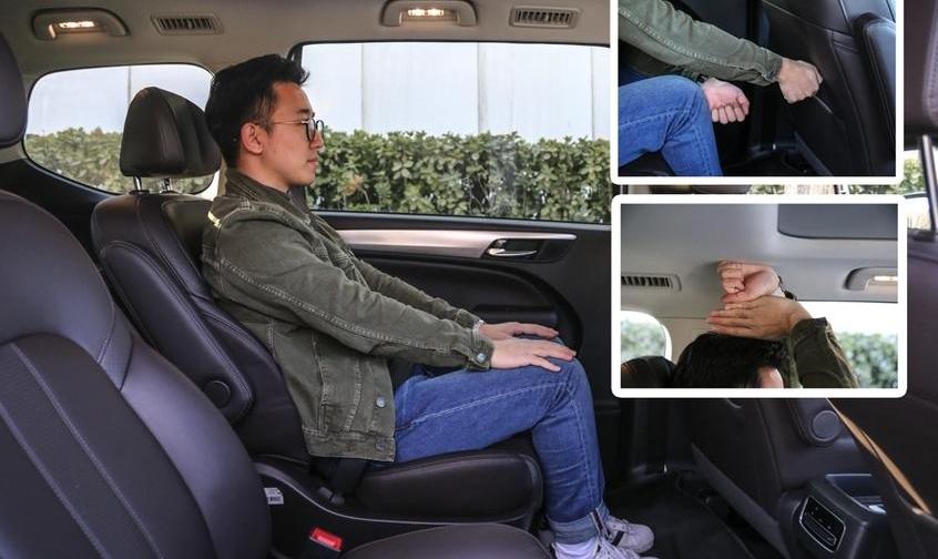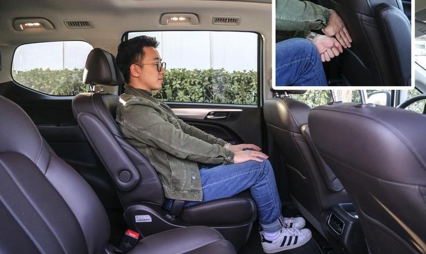 保持第一排座椅静止,将第二排座椅拉到底。此时,腿部空间为3拳,头部空间为1拳和4指。如果你不考虑第三排乘客,这个空间可以让你自由地跷二郎腿。