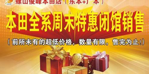 优先的优先的10月19日,罗山君丰东本、广本门店所有车型暂停销售,特惠!所有系列的汽车都在打折!前所未有的超低价,数量有限,直至售罄。感兴趣的朋友,请不要错过这个很棒的礼物!您现在打电话预订,也可以收到一份精美的到货礼物。活动详情:2380999、2382833!