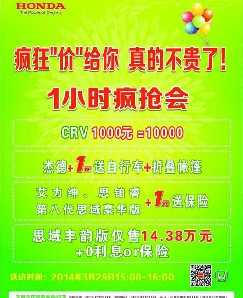 为你疯狂的“价格”,真的不贵!3月29日15时,东风本田一小时的暴走将用一枚核弹炸毁整个城市。CRV将预付1000至10000,仍有机会赢得免费更换;杰德+1元,然后送一辆折叠自行车和双人折叠帐篷;第八代思域豪华版、Splendor和Alessance+1元免费车险;思域风云版仅售14.38万元,享受0利息或保险。你还在等什么?快来抢购!详细查询