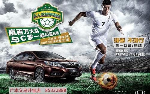 当我们的偶像罗纳尔多参加巴西世界杯时,我们只能隔着电视屏幕为他欢呼吗?你想亲眼目睹帅气酷炫的偶像克里斯蒂亚诺·罗纳尔多吗?以克里斯蒂亚诺·罗纳尔多为代表的广汽本田凌派现邀请您“直通巴西”,亲临现场支持您的偶像!从2014年2月24日开始,广汽本田将推出“星火斗志——凌牌杯五人制足球锦标赛”。只要你热爱足球,你就有机会参加巴西足球宴会之旅,与罗纳尔多一起在巴西大放异彩!