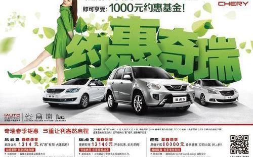 万物复苏,春天“造福”地球!3月1日,奇瑞汽车2014春季巨汇为您启程。TIGGO RUIHU 3与风云2号和E5合作,赚取巨额利润并保持折扣!活动将持续到5月31日。关于“惠”奇瑞,绿色起步,奇瑞好车回家!