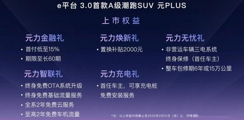 2月19日,比亚迪e平台30首款A级潮跑SUV元PLUS正式上市,新车共5款车型,官方指导价1318万元1598万元,并推出五大专享礼遇。