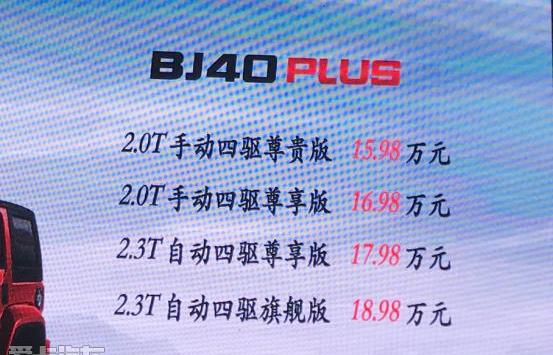 2018年6月17日,北京BJ40 PLUS正式上市,价格区间为1598-18.98万元。新车是北京BJ40的中期改款,对内饰和底盘进行了重大调整,使其比当前车型更精致。此外,新车继续搭载2.0T/2.3T涡轮增压发动机,动力输出非常强劲。