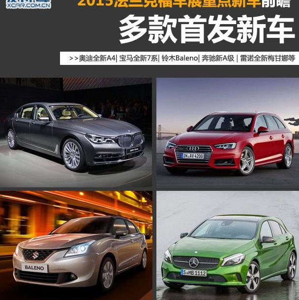 2015法兰克福车展主要汽车品牌宝马新一代7系奔驰新C级Coupe铃木Baleno英菲尼迪Q30保时捷PajunMINI新CLUBMAN奥迪新A4/A4 Avant(参数|查询)雷诺新一代Meganna奔驰新A级爱卡汽车网络表www.xcar.com.cn 2015法兰克福车展重点SUV品牌宝马新代X1宝沃首款SUV Bentayga捷豹F-PACE[参数|询价]特斯拉Model X(参数|询价)起亚新一代Sportage大众新途观(参数|报价)概念车。www.xcar.com.cn车型:宝马新一代7系法兰克福车展:正式亮相新车点评:宝马新世代7系设计增加了更多年轻运动元素,内饰的高级感和舒适度也得到了全面升级,大量尖端技术配置的加入也让宝马新7系有了强烈的未来感,凸显了其旗舰地位,成为梅赛德斯-奔驰s级最具威胁的竞争对手(参数|询价)。外观方面,宝马新一代7系采用了新的家族式外观设计,典型的特点是使用“开角”大灯设计,并可选择安装激光大灯。大灯的形状也更加细长。下进气格栅的设计有所改变,仍然采用贯穿式设计,但增加了LED日间行车灯。此外,新款7系还将推出M套件版本,该版本的前保险杠设计和轮圈比常规车型更具运动感。