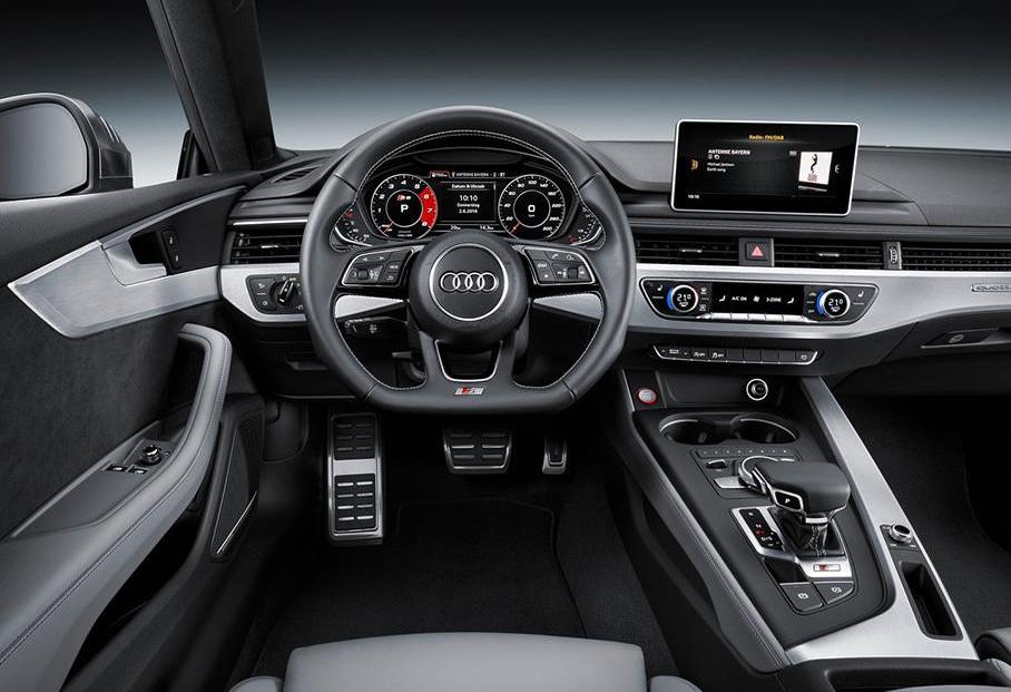 奥迪新款S5 Coupe的科技感更强。看完外观后,让我们走进车内看一看。奥迪为新款A5 Coupe/S5 Coupe的内饰赋予了更强的科技感。首先,它延续了新款奥迪A4的全液晶12.3英寸仪表盘,可以转换各种菜单显示形式。此外,新款三幅式多功能方向盘、8.3英寸独立中控液晶屏、技术增强的换挡机构都无一例外地出现在新款车型上。