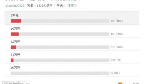 在竞争激烈的紧凑型SUV市场中,其市场正趋于饱和,许多制造商将新的销售增长点瞄准了小型SUV市场。铺天盖地的报道下,许多消费者对此并不陌生。在爱卡此前的一项调查中,789名网友更喜欢实惠的价格,大多数消费者选择8万元作为起步价。● 价格将是决定因素在之前的调查中,498名网友(40%)认为小型SUV的起步价应该在8万元左右,而442名网民(30%)认为起步价应该是12万元左右。只有80名网友(占10%)认为起价为14万元。可以看出,对于大多数消费者来说,购买小型SUV的主要因素是它更便宜的价格和外观。