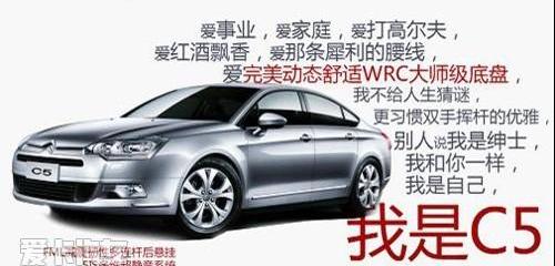 东风雪铁龙C5:“热爱事业,热爱家庭,热爱高尔夫,热爱红酒的香气,热爱锋利的腰线,热爱完美动感舒适的WRC主底盘,我不给生活带来困惑,但更习惯于双手挥杆的优雅,别人说我是绅士,我像你,我是我自己,我是C5。”