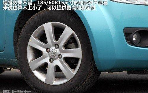 7辐铝合金轮毂的尺寸达到了15英寸,与车身的视觉效果很匹配。185/60R15轮胎尺寸对于派喜来说并不算太小,可以提供更高的稳定性。由于成本原因,该轮胎品牌采用了国内制造商泰丰的产品。就几天的驾驶体验而言,它在静音方面表现不错,抓地力稍显不足。