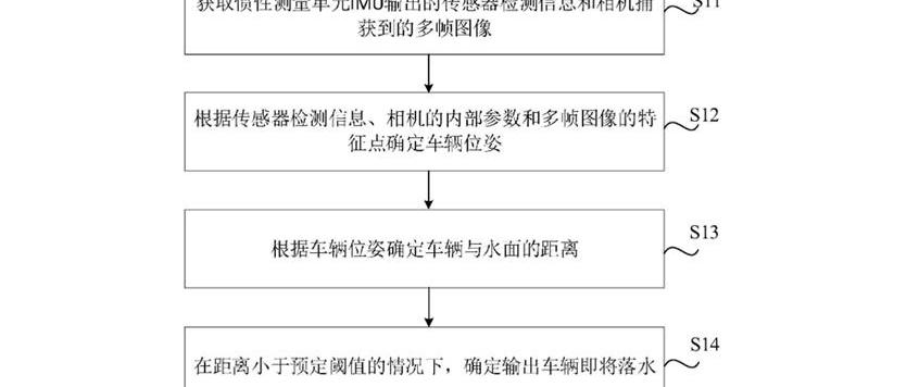 根据专利摘要,本公开涉及自动驾驶领域,特别涉及一种车辆落水检测方法、车辆、计算机可读存储介质和芯片,包括获取惯性测量单元IMU输出的传感器检测信息和相机拍摄的多帧图像,基于传感器检测信息、相机内部参数和多帧图像的特征点来确定车辆姿态,并基于车辆姿态来确定车辆与水面之间的距离。当车辆与水面间的距离小于预定阈值时,则确定车辆即将落入水中。