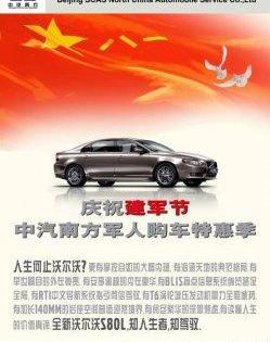 沃尔沃在北京的代理商北京中汽南方百旺店在8月1日庆祝建军节。在7月和8月的这一天,百旺店全体员工携行政特级沃尔沃S80L,向祖国最忠诚的儿女和最受尊敬的时代英雄致敬!
