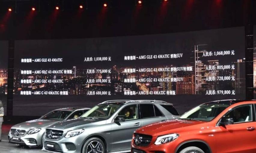 C43特别版,688000 E43特别版;979800 GLC43,698000;GLC43特别版,775000 GLC43 Coupe,728000;GLC43 Coupe特别版,805000 GLE431038000;GLE43跑车,106.8万