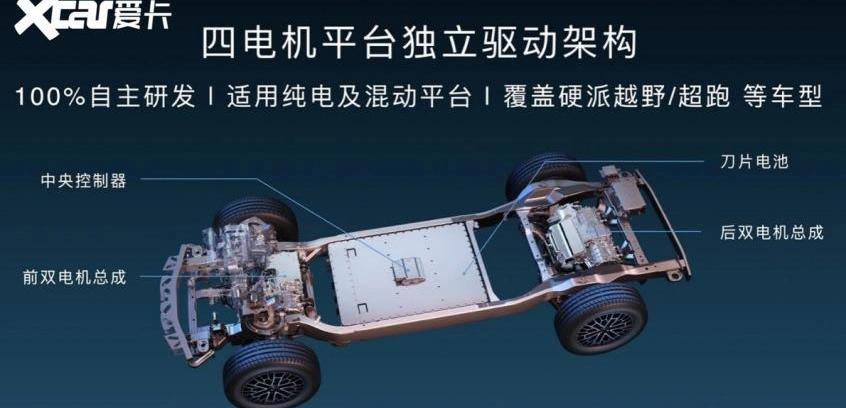 不过,在介绍具体功能之前,我们先来看看这个品牌的核心——易四方科技平台。简单来说,易四方是一种基于四电机的驱动技术,不同于之前燃料动力汽车的内燃机和电动汽车中常用的双电机和三电机驱动。易四方技术平台采用的四电机分布式驱动形式,可以对每个车轮进行最精确的控制,实现真正的四轮独立驱动,这是所有酷炫功能的来源。
