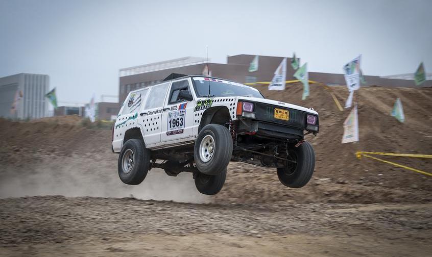 如前文所述,本次比赛从内蒙古出发,对参赛者的第一次测试是乌兰察布境内一条长约2公里的综合赛道。参加比赛的选手大多驾驶的是经过改装的越野车,而地面上飞扬的灰尘和越野“龟背轮胎”带来的石头是最吸引观众观看的元素。