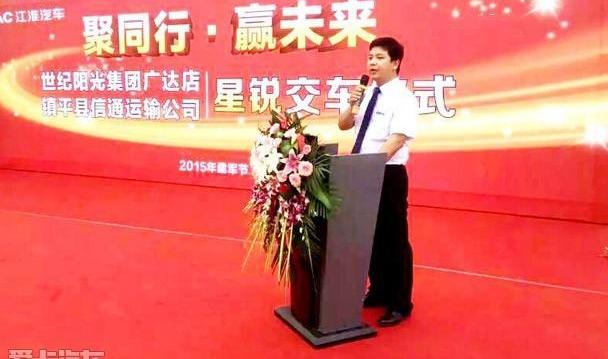 镇平县新通运输公司在充分肯定江淮星瑞品质的基础上,选择世纪阳光集团广达店收购江淮星瑞。河南世纪阳光是河南首家门店,荣获全国销售冠军奖和星级服务示范标杆;此次收购镇平县新通运输公司订单,也是世纪阳光多年来依靠质量赢得市场、依靠品牌赢得形象、依靠服务赢得客户的结果。我相信,凭借江淮星瑞卓越的设计理念和卓越的整车制造技术,这批星瑞汽车必将有助于镇平市新通运输公司的业务发展。