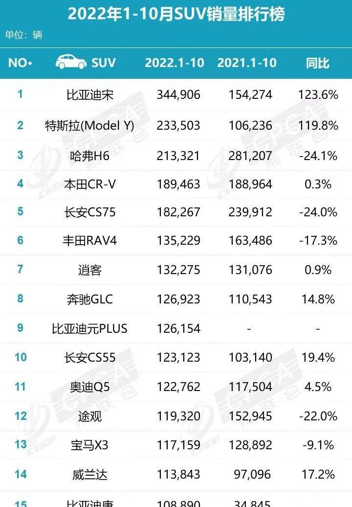 舆论车:除了发布10月SUV销量榜单外,乘联会还发布了前10个月SUV总销量榜单。冠军仍然是比亚迪的宋,而亚军则被特斯拉的Model Y夺走。由此可见,中国人对特斯拉品牌的认可度还是比较高的。第三名是哈弗的H6,共售出21.3万辆……