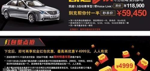 辽宁(大连)别克旗舰店内:上海通用汽车与天猫联手庆祝“11.11购物狂欢节”。从全国400多家经销商中筛选出52家优质经销商,为4辆凯悦专车推出限时半价闪售活动。大连只有一家在售,就在大连的别克旗舰店!与此同时,橙色天猫限量版安哥拉首次上线,大幅降价1.8万台,全国限量1111台!活动当天将有现金抽奖活动!中奖率是100%!最高可享受4999元现金!余额支付仅限于11月11日!可以登录详细信息http://buick.tmall.com/shop/view_shop.htm同时,对于11月1日至11月11日实现销售的别克天猫用户,上海通用汽车将从日常系统中随机抽取5名用户,可额外享受直接优惠4999元!